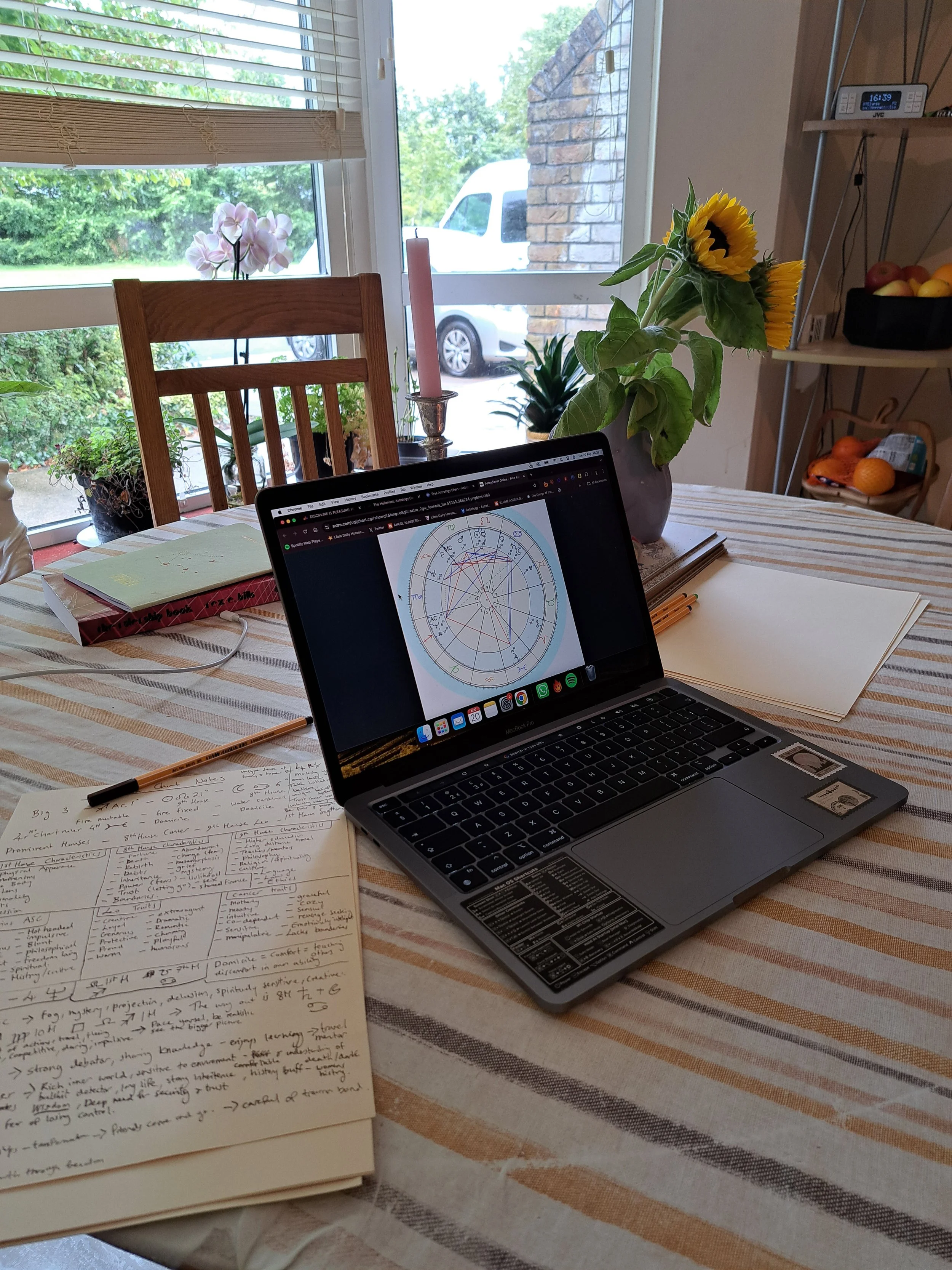 I offer a range of astrology readings, including Natal Chart Readings, Year Ahead Readings, and sessions focused on specific questions.